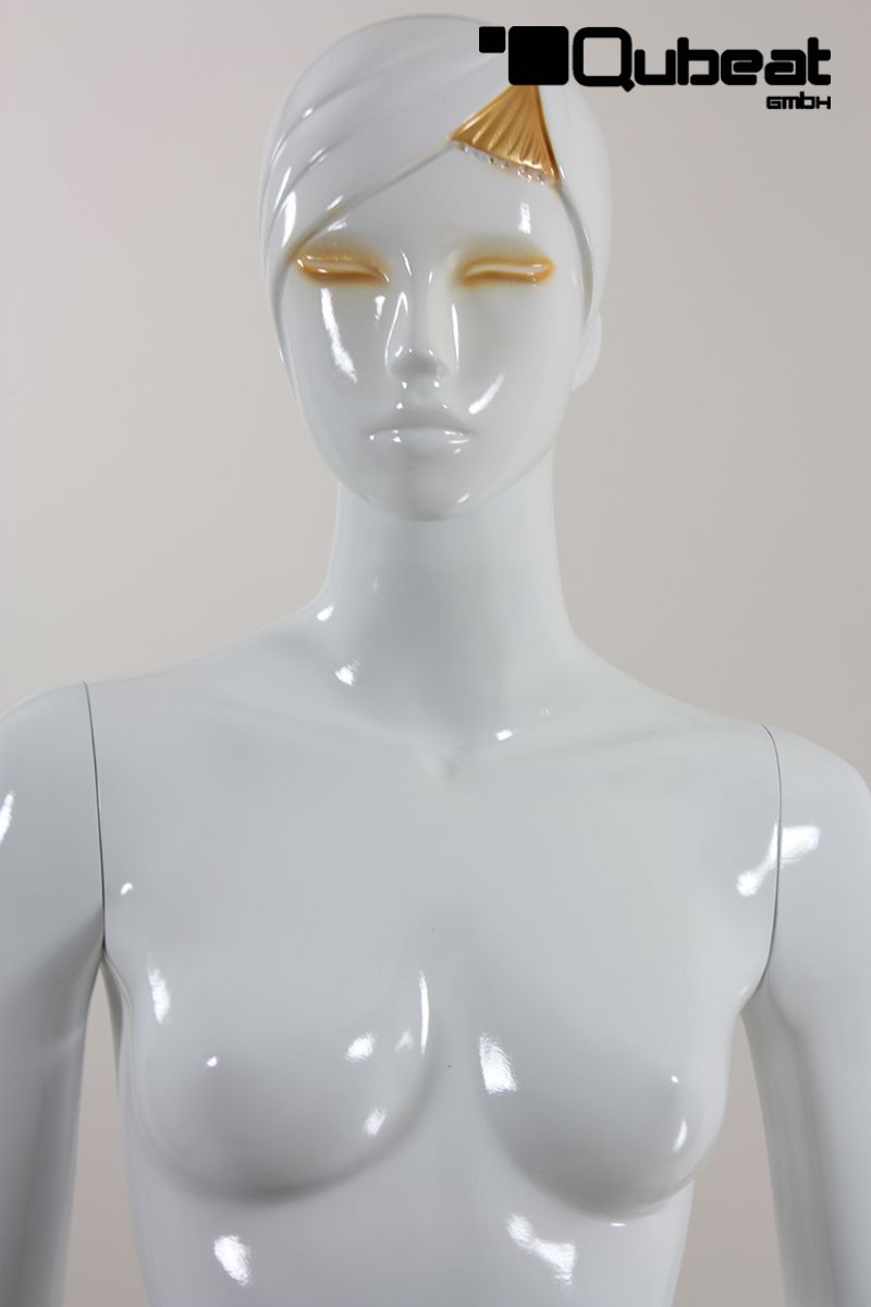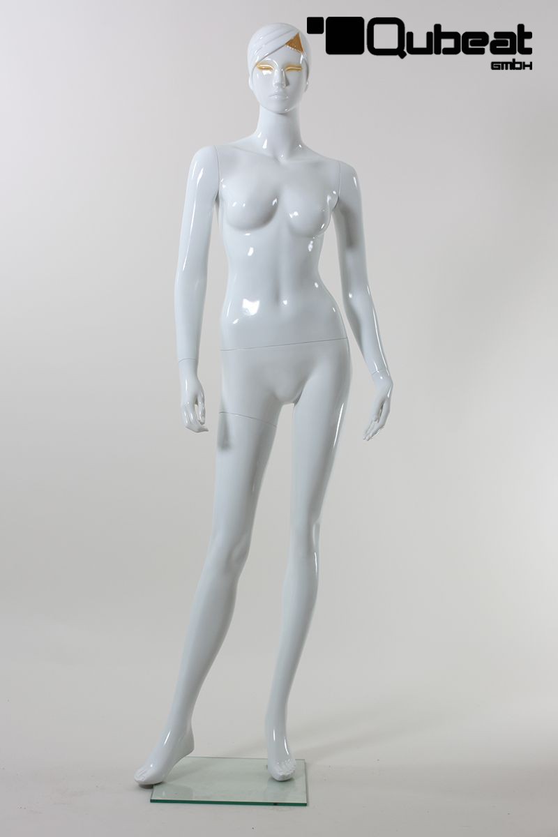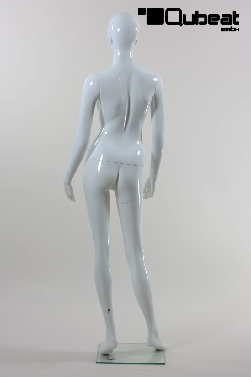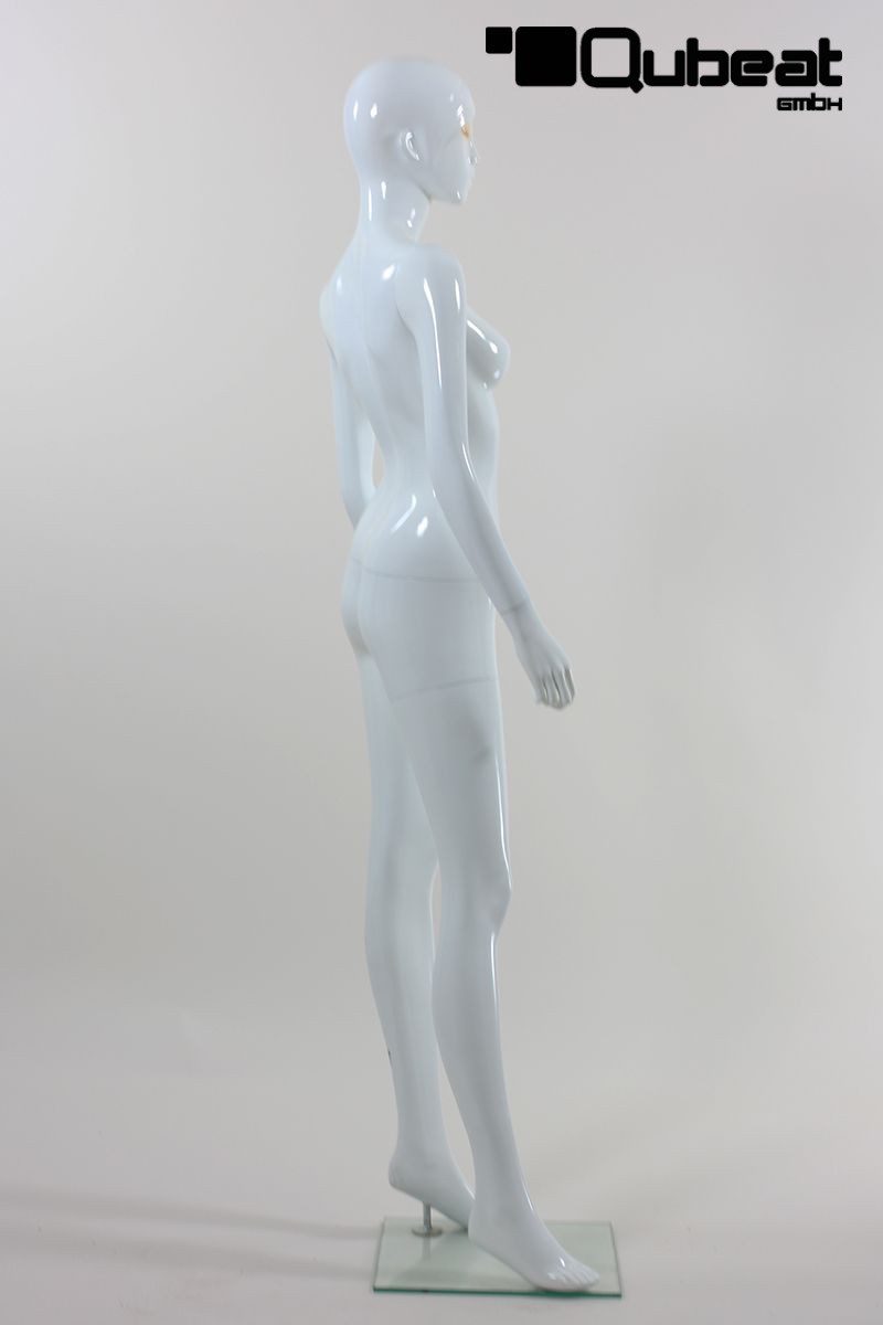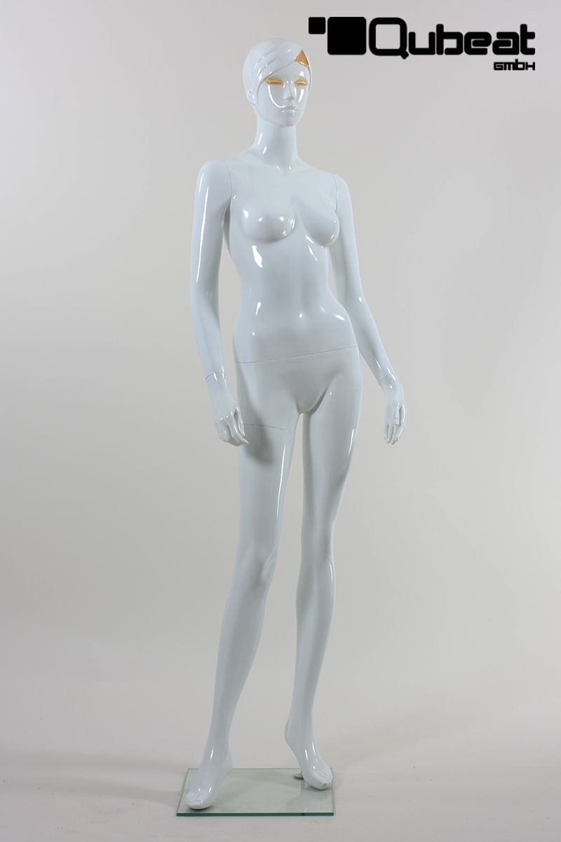 This is a female dummy, fabricated with . The window mannequin in White shining colour has an abstract face. This article has a metal thorn on a glass top on which the mannequin can be fixed. Which gives it stable and safe posture. This mannequin is slim. The dummy\'s hair is modeled and painted, making the use of a fitting wig unnecessary. Is fixed through foot or calf. The fixing through the side lets you put socks and shoes on the dummy, without damaging them.