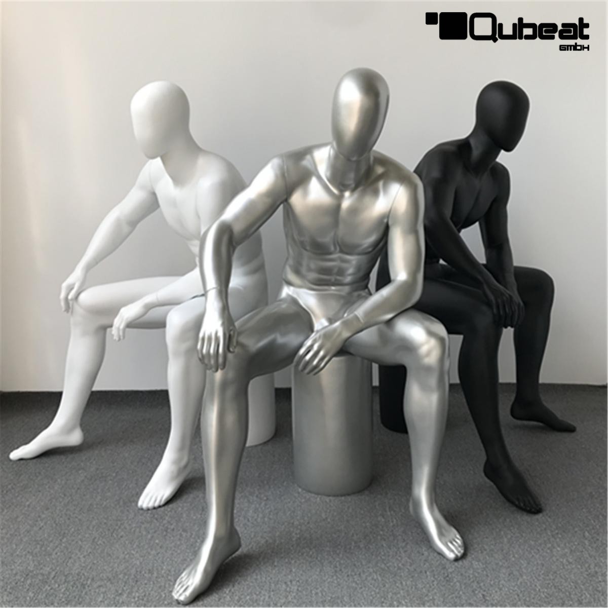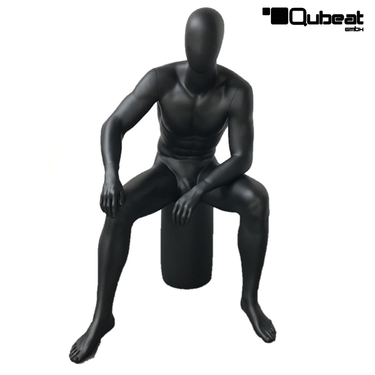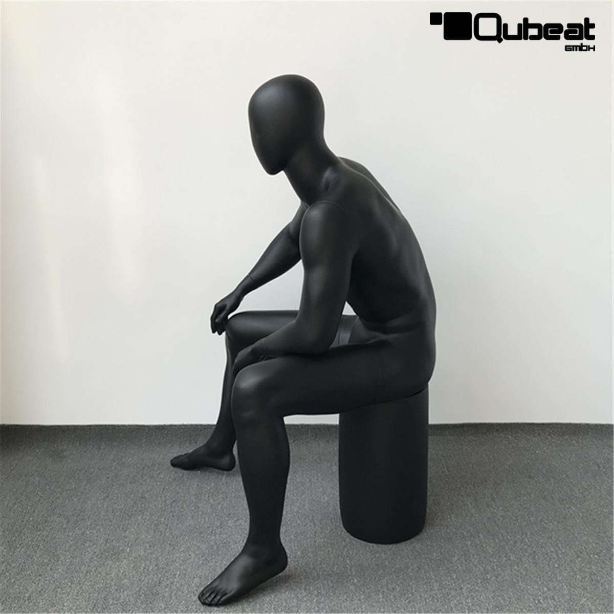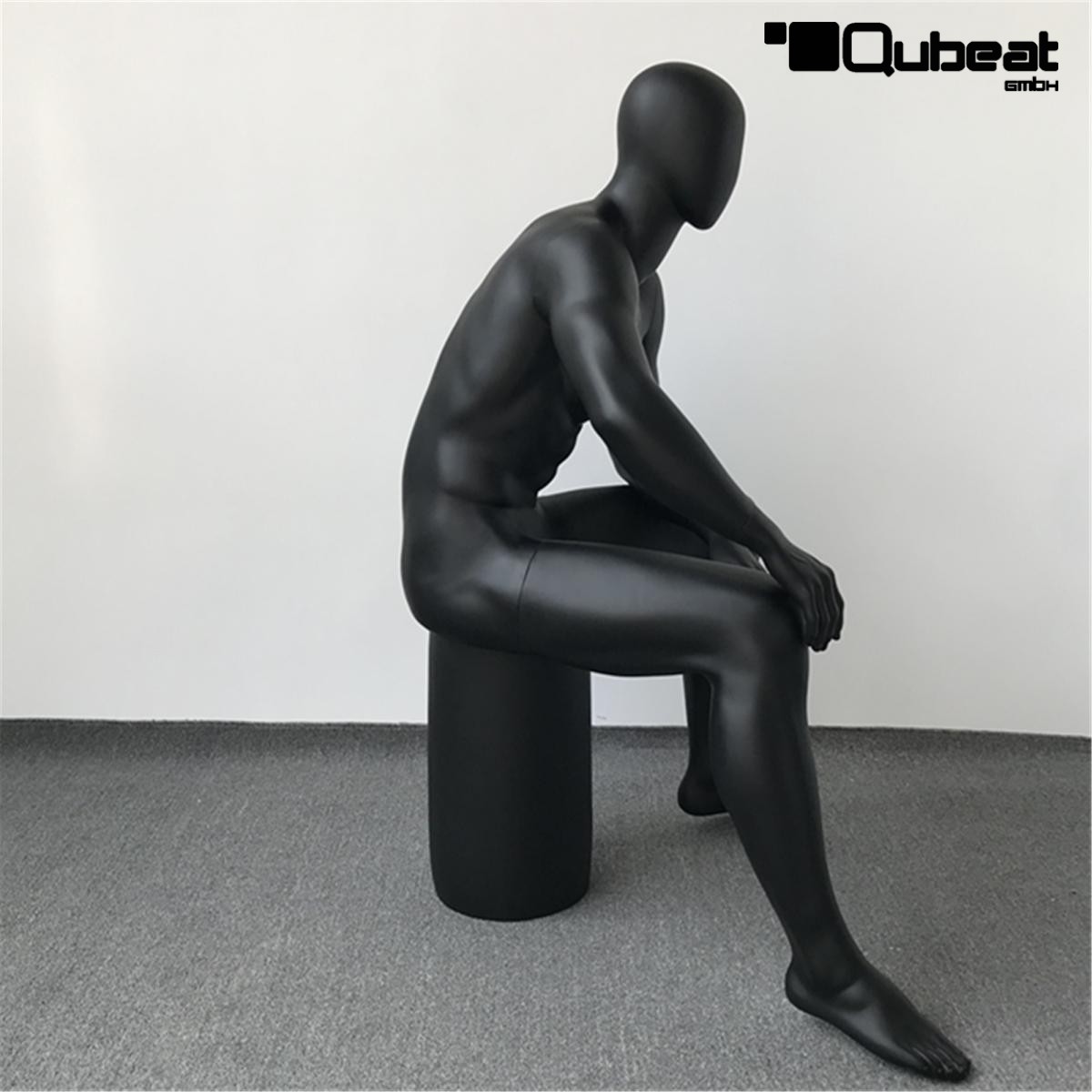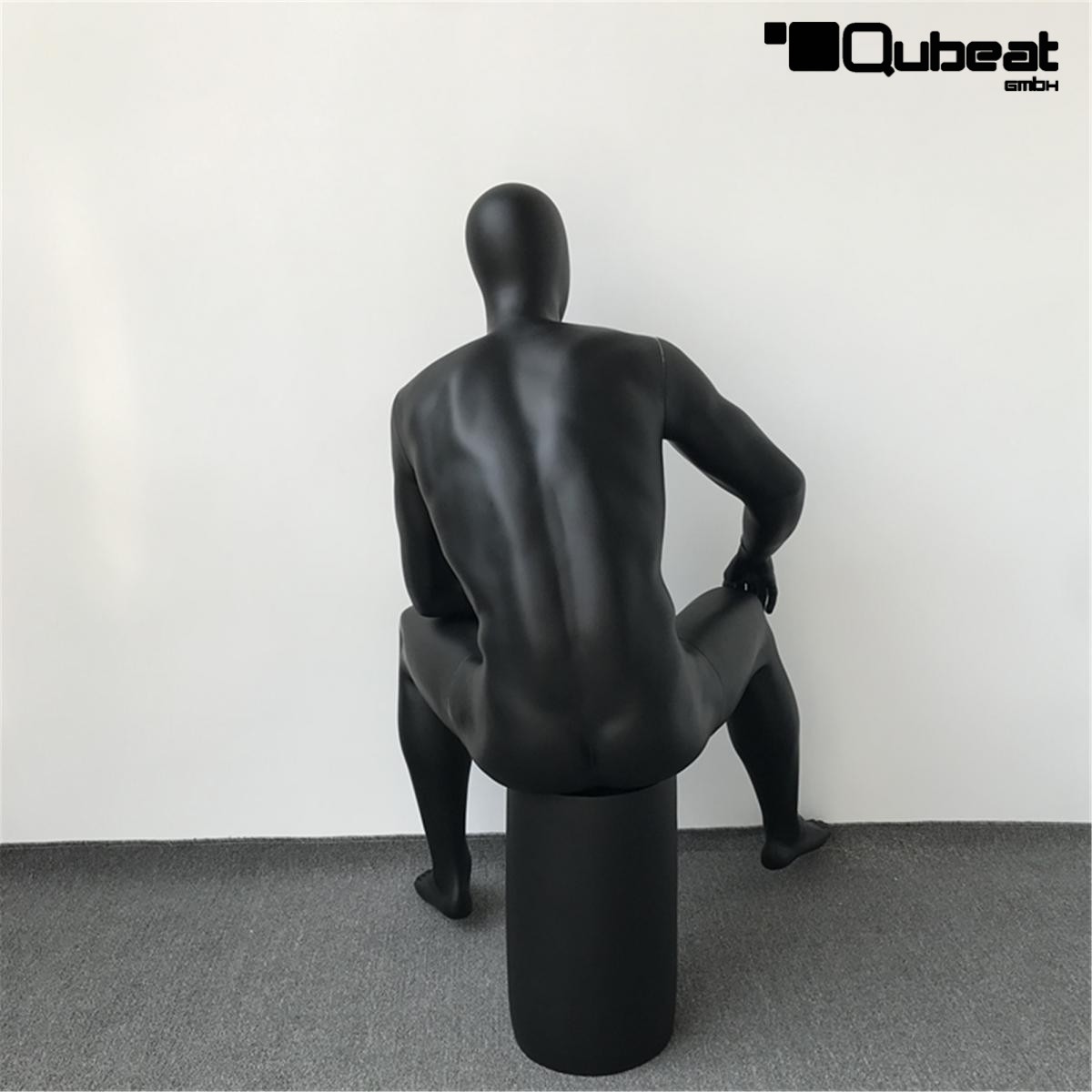 This is a male mannequin, fabricated with . The window mannequin in Black colour is faceless. The dummy comes with a stool, it can, however, also be placed upon shelves, cupboards and similar. The dummy is doing a sporty movement.,